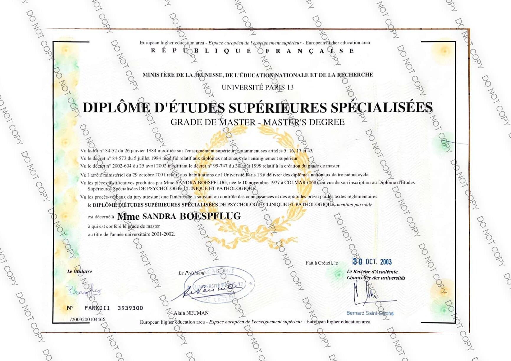 2002 : Master 2 (D.E.S.S.) Psychologie clinique et pathologique – Université Paris XIII